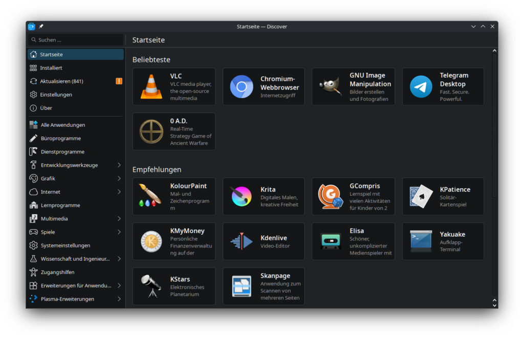 Nutze also die vielfältigen Möglichkeiten von Kubuntu um Dich vollständig zu entfalten. Die meisten unten aufgezeigen Anwendung sind Applikationen, welche bereits vorinstalliert sind oder mit wenigen Klicks unter Discover nachinstalliert werden können.